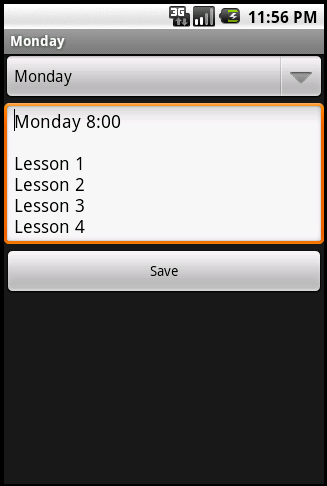 Idea jest taka, by po kliknięciu w guziczek u góry pokazywała się lista wyboru z nazwami dni tygodnia, a po wybraniu którejś z wartości pokazywać się będzie zapisana w bazie pod kluczem z nazwą tygodnia "notatka" będąca planem lekcji na dany dzień. Plan lekcji będzie pokazywał się w polu tekstowym pod guziczkiem do wyboru.